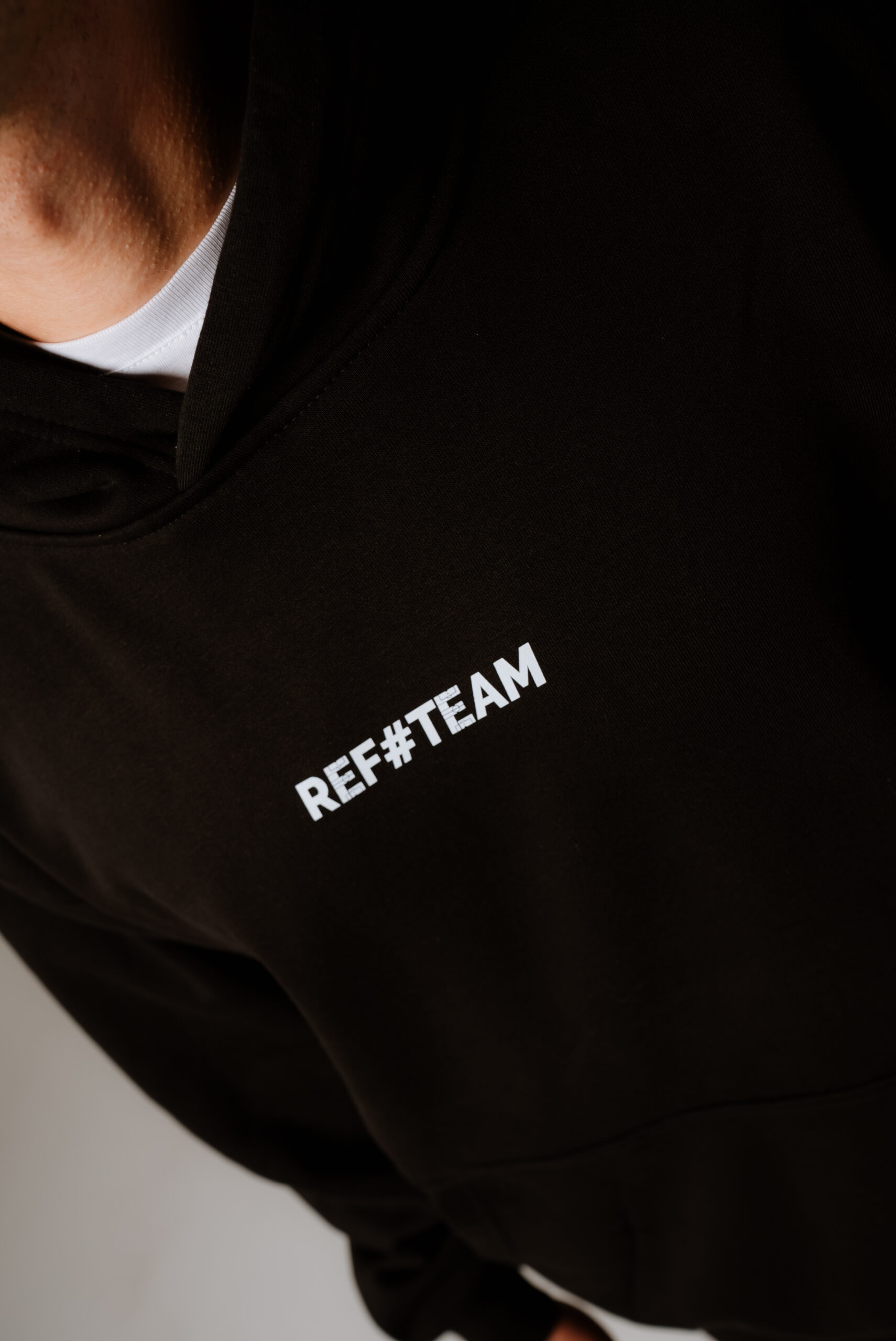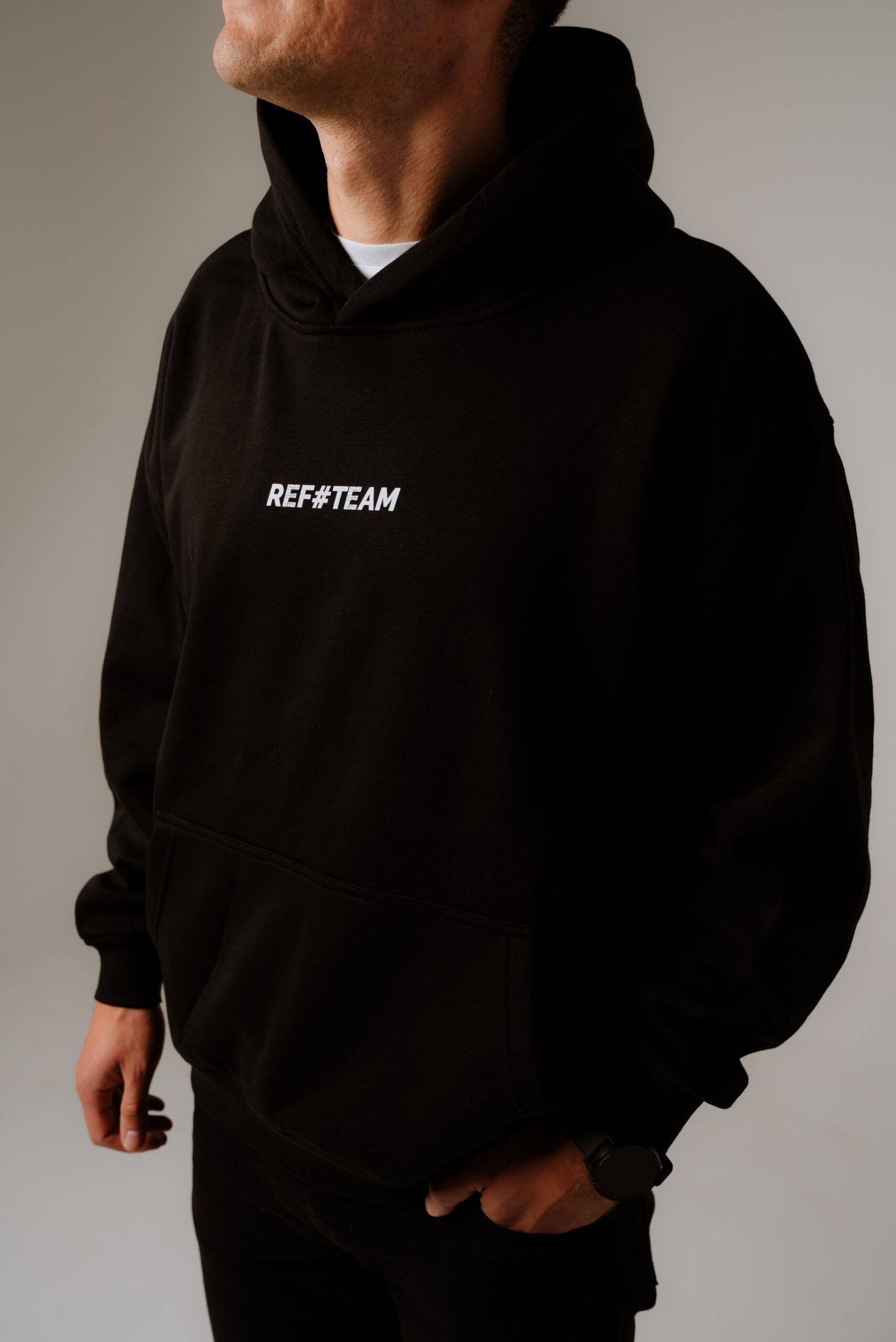 Oversizowa czarna bluza z kapturem idealna na co dzień. Wysokiej jakości bawełna oraz solidne wykonanie gwarantują trwałość i komfort użytkowania. Bluza posiada praktyczną kieszeń typu „kangur” oraz wykonany techniką sitodruku nadruk REF#TEAM.