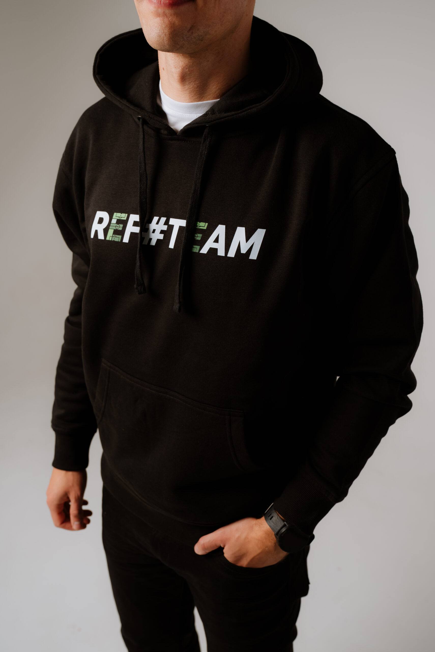 Klasyczna czarna bluza z kapturem idealna na co dzień. Wysokiej jakości bawełna oraz solidne wykonanie gwarantują trwałość i komfort użytkowania. Bluza posiada praktyczną kieszeń typu „kangur” oraz wykonany techniką sitodruku nadruk REF#TEAM.