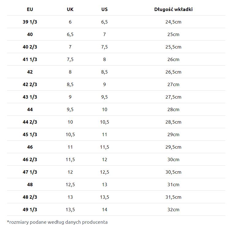 | Rozmiar | 36, 36 2/3, 37 1/3, 38, 38 2/3, 39 1/3, 40, 40 2/3, 41 1/3, 42, 42 2/3, 43 1/3, 44, 44 2/3, 45 1/3, 46, 46 2/3, 47 1/3, 48 |