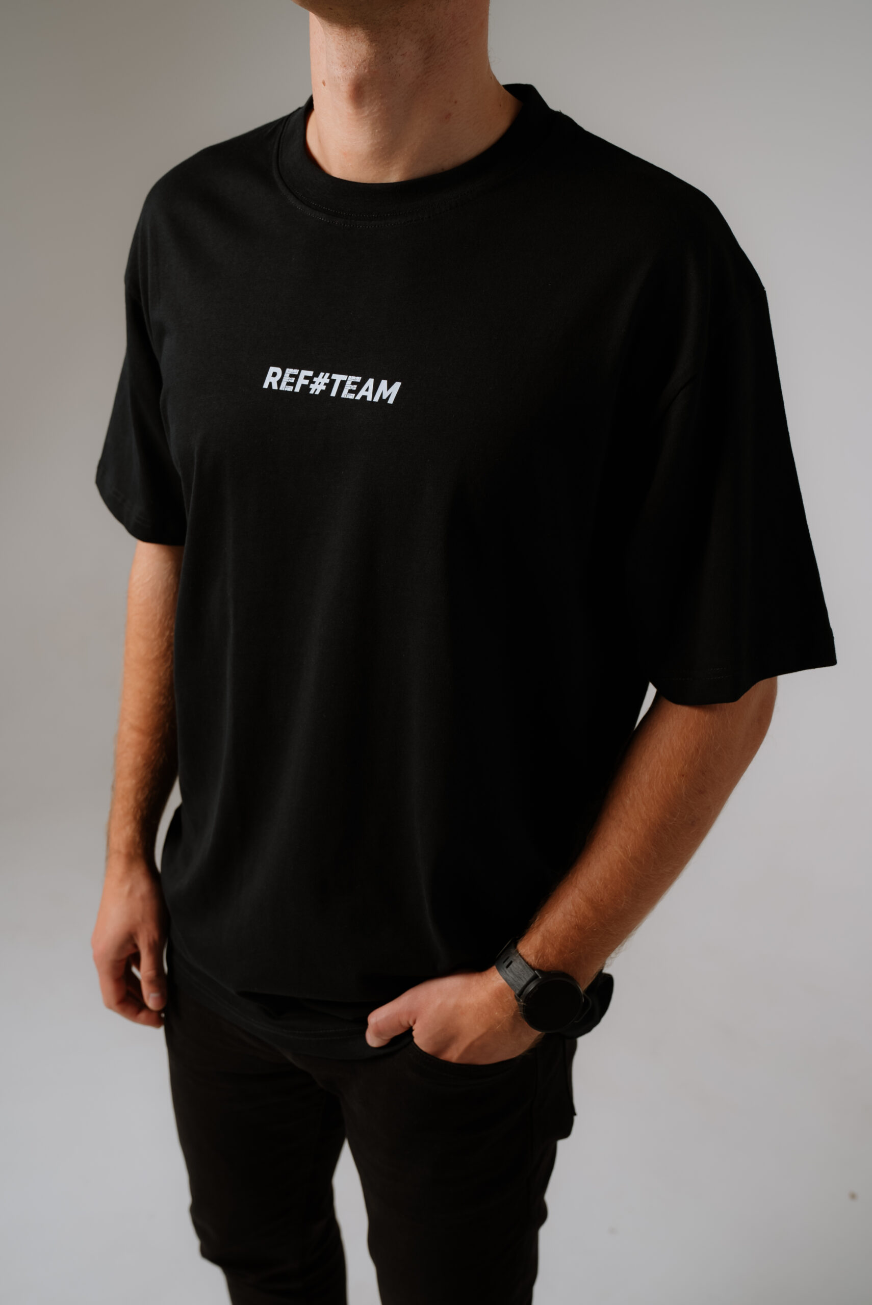 Czarna koszulka typu Oversize z małym nadrukiem REF#TEAM. Wysokiej jakości bawełna, podwójne przeszycia na rękawach, szyi oraz u dołu.