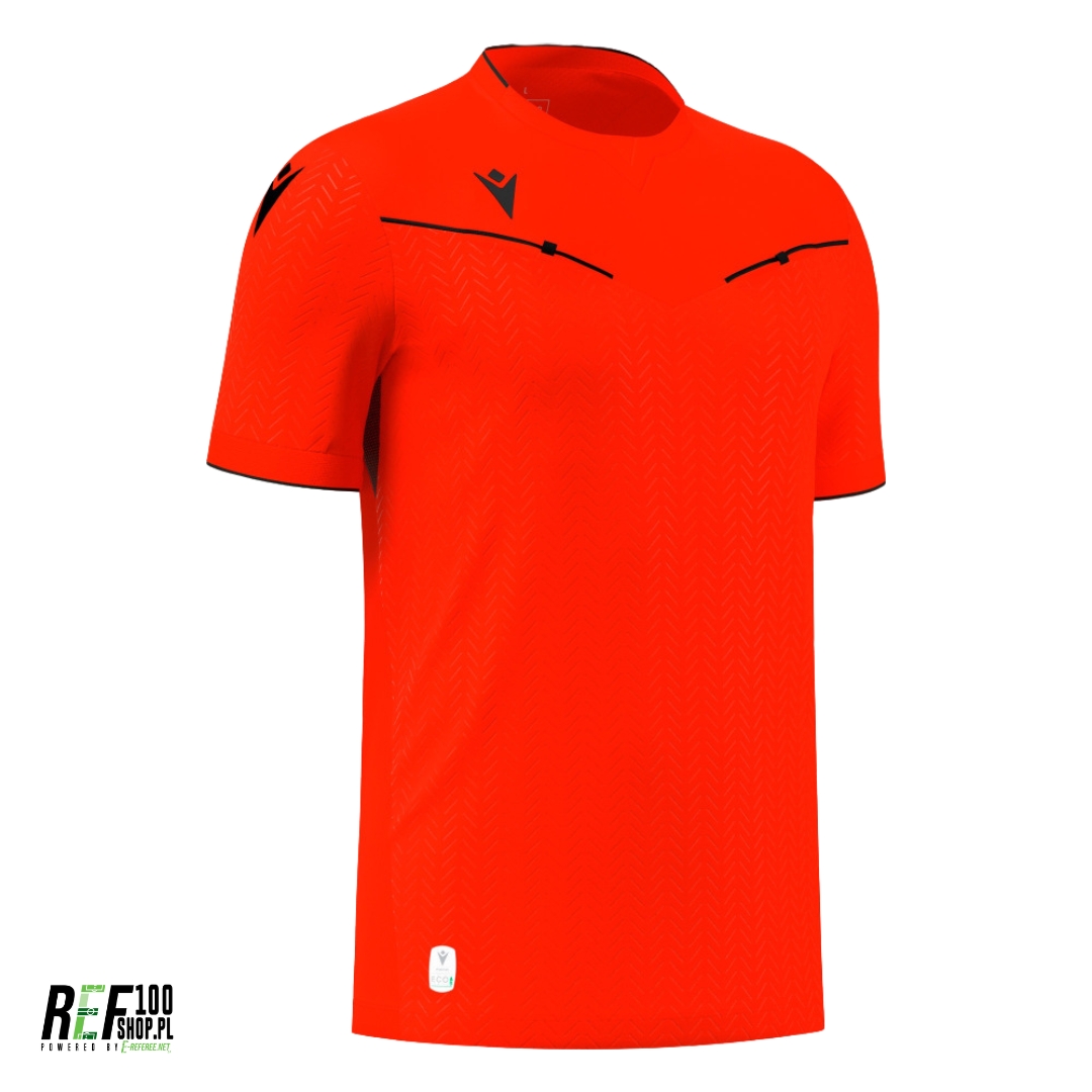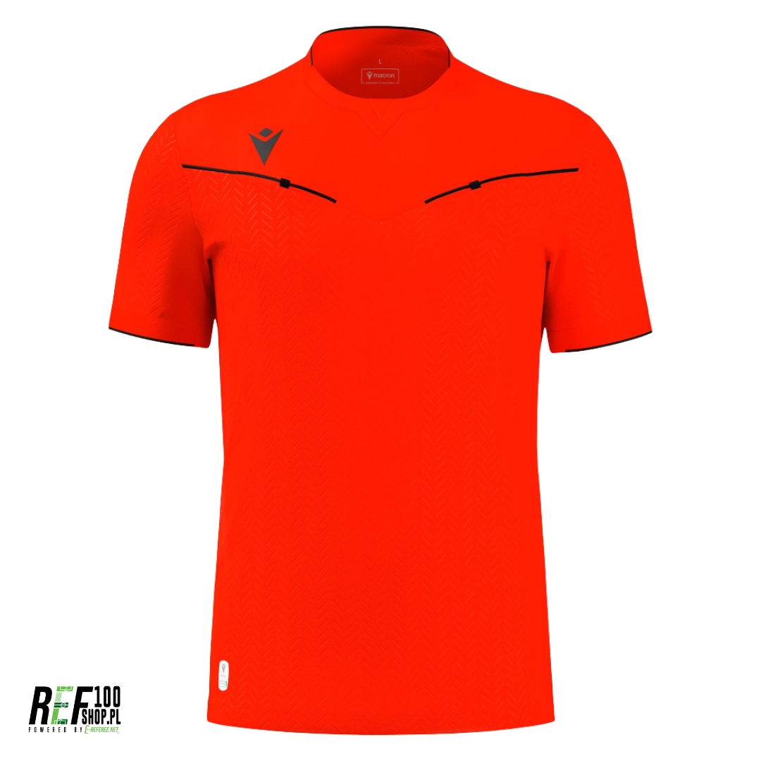 Koszulka sędziowska Macron UEFA Ponnet Eco – czerwona z krótkim rękawem jest wykonana w całości z eko-tkaniny, uzyskanej w 100% z przetworzonego PET. Pod szyją znajduje się wstawka z przodu i dzianina z tyłu. Wstawki z ekologicznej siateczki pod pachami i z tyłu szyi zapewniają lepszą wentylację. Logo Macron Hero jest wykonane z silikonu. Przód i rękawy mają wytłoczoną teksturę, a koszulka ma dwie kieszenie na kartki o ergonomicznym kształcie i zapięciu na rzep.