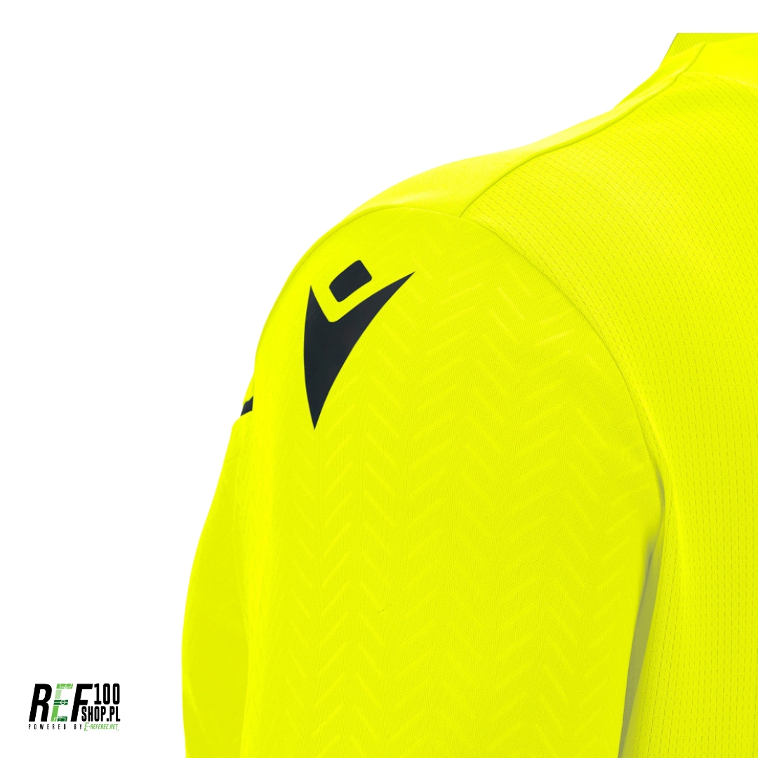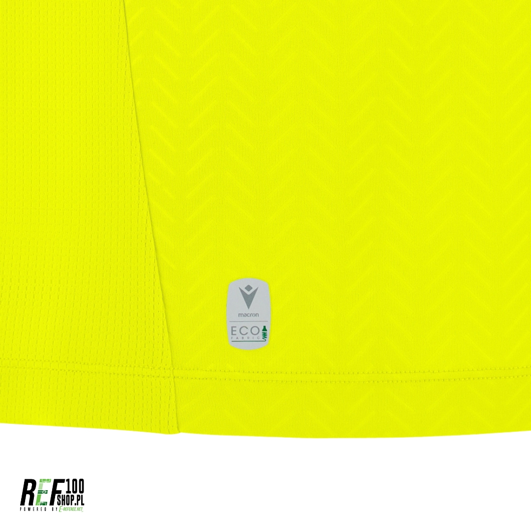 Koszulka sędziowska Macron UEFA Ponnet Eco – neon yellow z długim rękawem jest wykonana w całości z eko-tkaniny, uzyskanej w 100% z przetworzonego PET. Pod szyją znajduje się wstawka z przodu i dzianina z tyłu. Wstawki z ekologicznej siateczki pod pachami i z tyłu szyi zapewniają lepszą wentylację. Logo Macron Hero jest wykonane z silikonu. Przód i rękawy mają wytłoczoną teksturę, a koszulka ma dwie kieszenie na kartki o ergonomicznym kształcie i zapięciu na rzep.