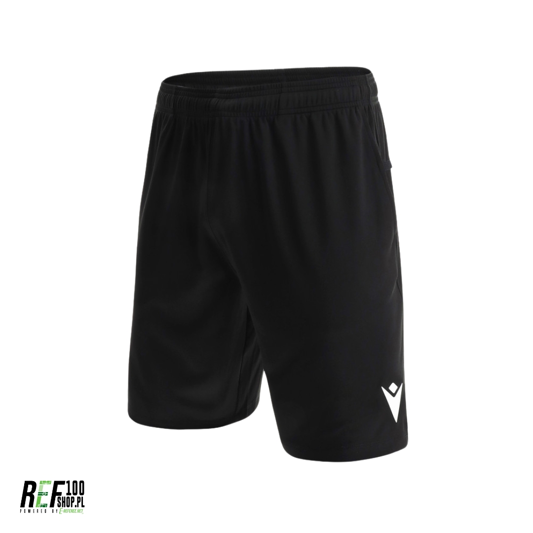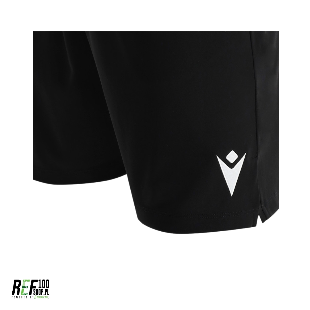 Spodenki sędziowskie Macron Cover w kolorze czarnym. Spodenki wykonane zostały w 100% z poliestru. Kieszenie boczne są zapinane na rzepy. Spodenki nie posiadają tylnych kieszeni.